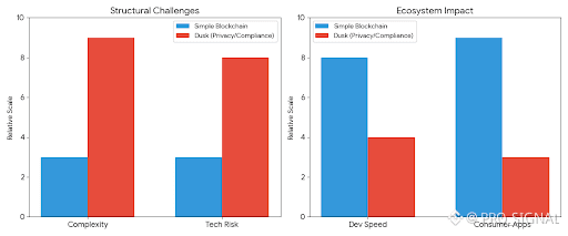 There are also limits and trade-offs. A system that supports privacy, compliance, and complex assets is more complex than a simple public blockchain. This can mean slower development, higher technical risk, and fewer simple consumer applications. It also depends on regulators and institutions being willing to use on-chain systems, which is still a gradual process. Dusk does not remove these challenges, it only provides a technical foundation to deal with them.