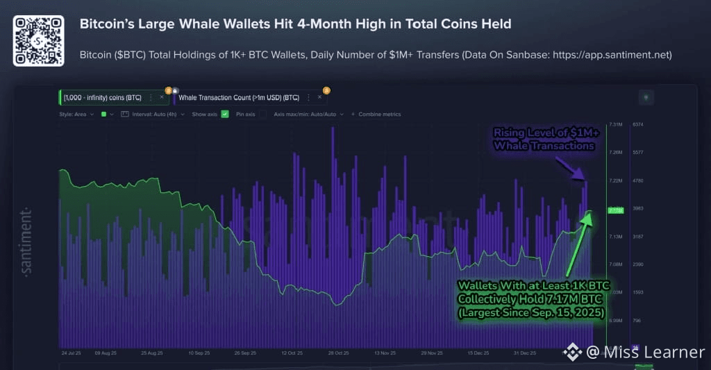 š Santiment data shows wallets holding 1,000+ BTC have accumulated 104,340 BTC in recent weeks ā a 1.5% increase.