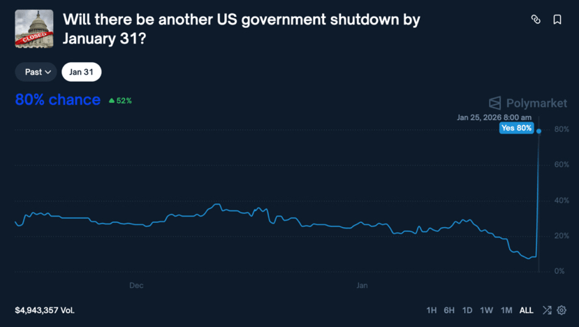 Just three months after the last calm, Washington is about to face another 'food shortage'! Currently, less than a week remains until the funding expires on 1/30, and players on Polymarket have already bet an 80% chance that the government will shut down again. This time, both parties are refusing to back down, and the tension is even stronger than last time! 🔥$BTC $ETH $BNB