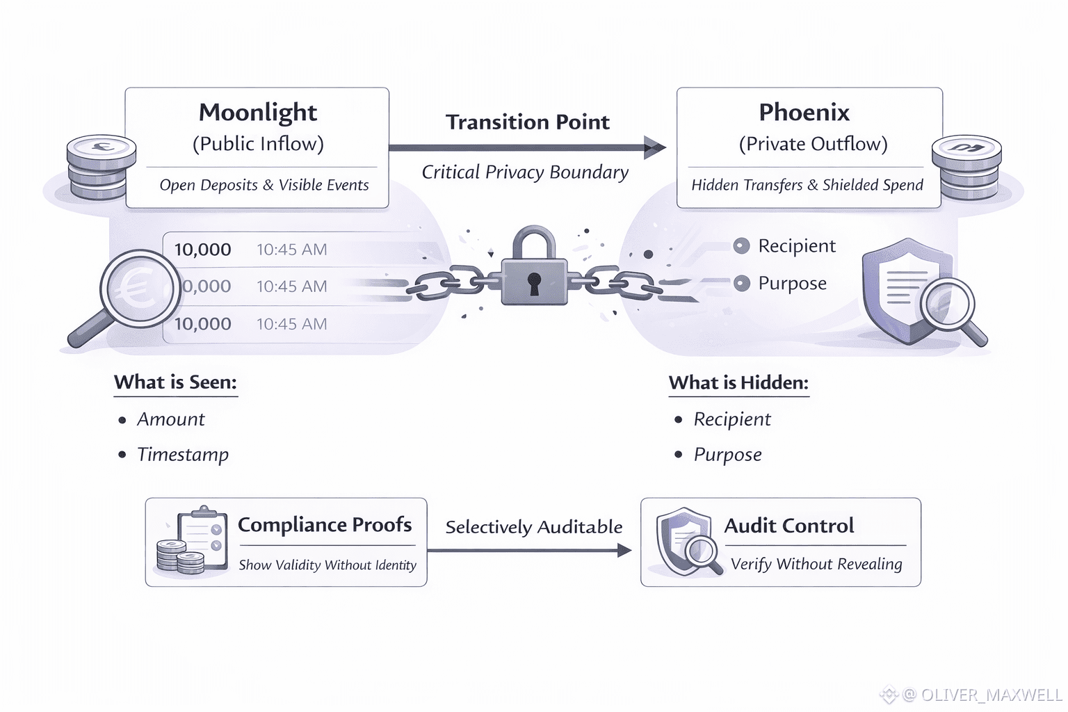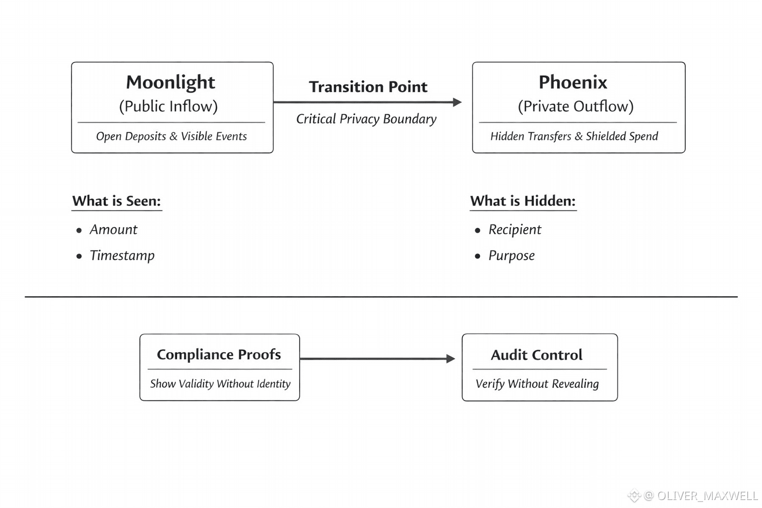 Because Dusk pairs privacy with auditability, Phoenix forces Dusk to define who can see what, under what control, and what can be proven without reopening the flow graph. A Phoenix spend that is selectively auditable implies some controlled capability to reveal, explain, or prove properties of the spend when a legitimate authority demands it. Dusk has to make that capability usable without making it abusable, because a compliance feature implemented as an unstructured backdoor would collapse trust in Phoenix. The hard requirement for Dusk is that any audit path at the Phoenix boundary must be narrow, intentional, and defensible, so that a public inflow can be spent privately without turning every private spend into a potential coercion point.