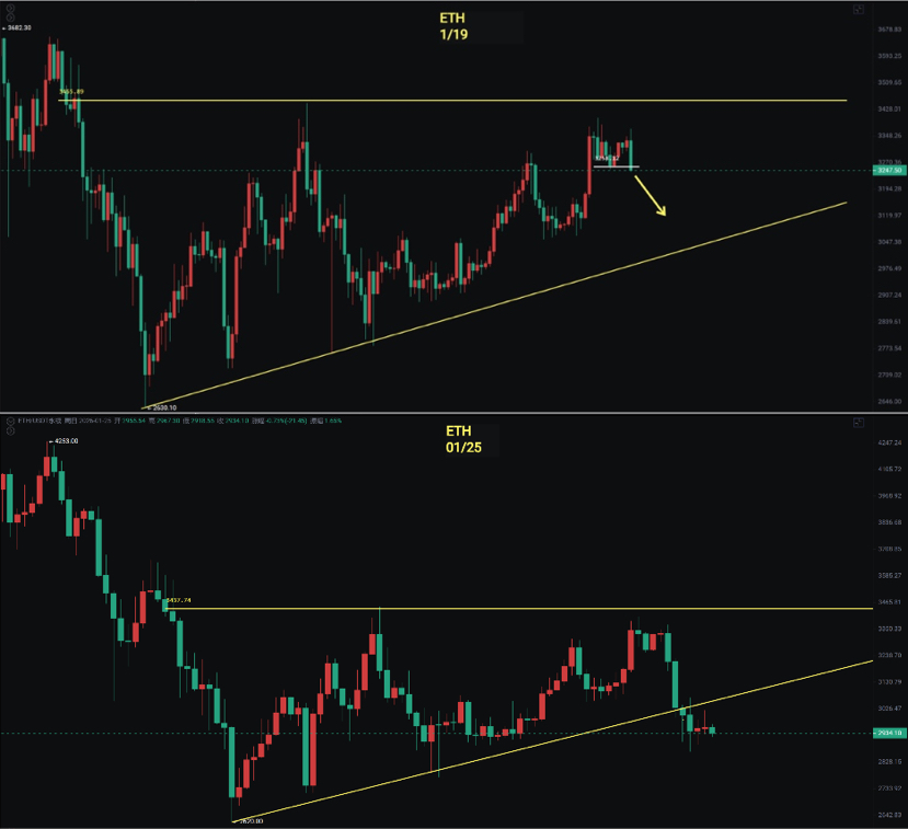 The larger cycle is similar to Bitcoin. The daily line has closed again below 3060, breaking below the lower edge of the ascending triangle and rebounding without recovering. The market remains bearish. However, the gentleman insists on shorting during rebounds and does not recommend chasing short positions.
