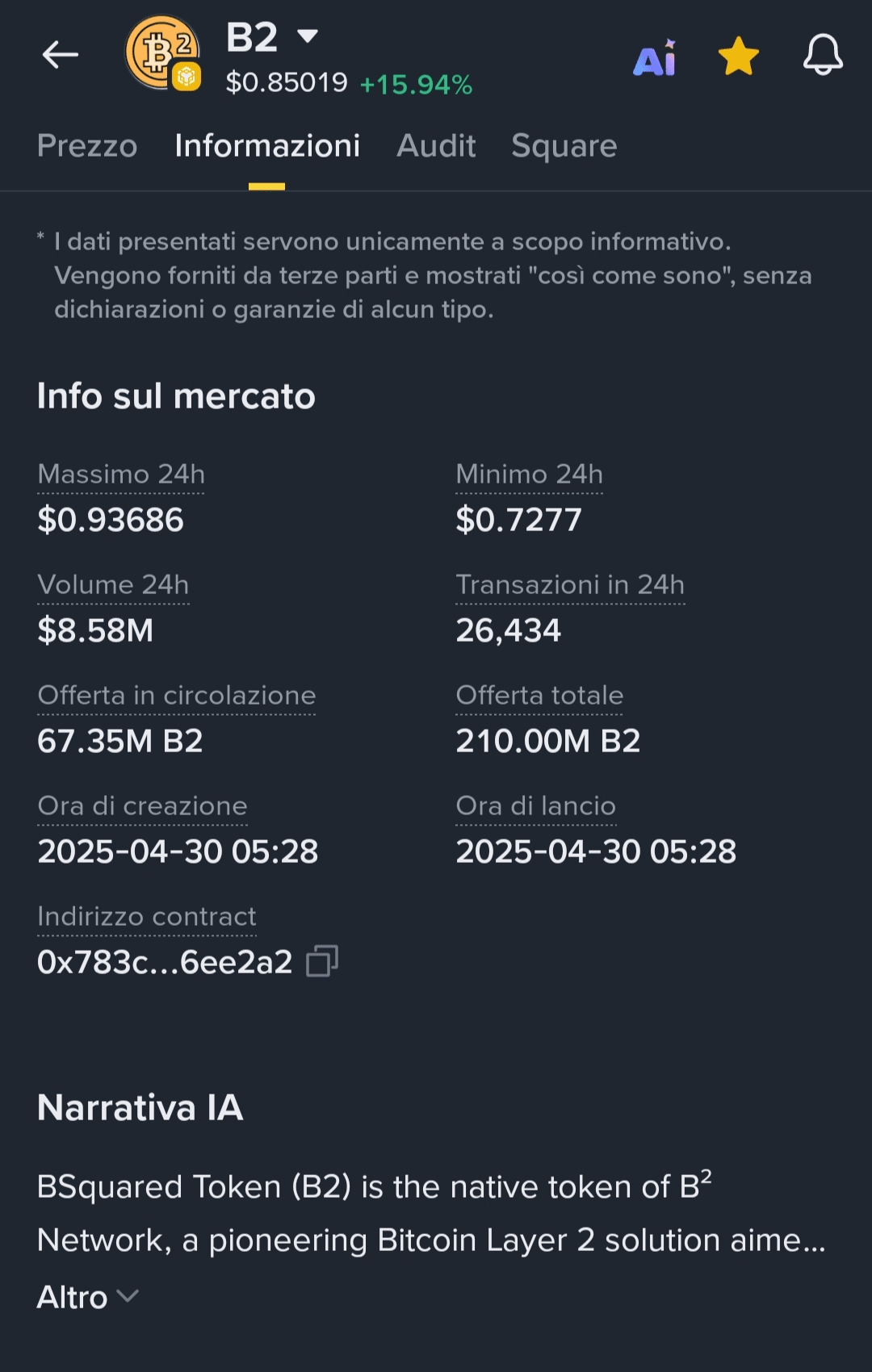 Narrative: Solid project in the Bitcoin L2 + AI sector. Low capitalization ($57M), high volatility.