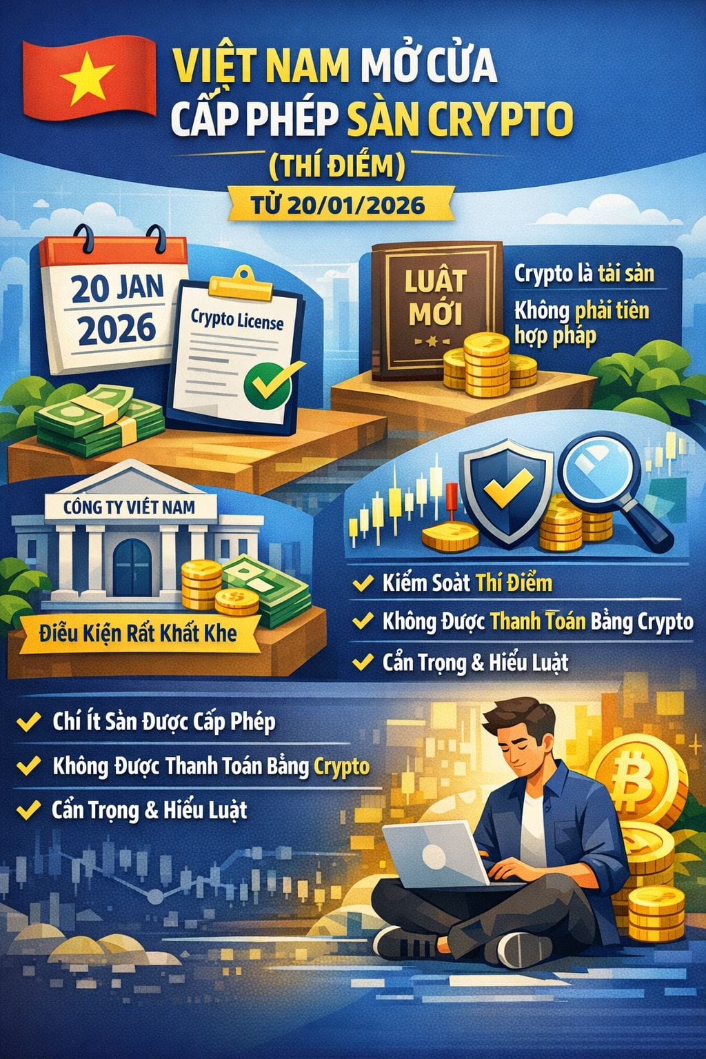 From 20/01/2026, Vietnam will officially start receiving applications for licensing digital asset exchanges. This is a pilot program lasting 5 years, aimed at testing safe management of the crypto market.