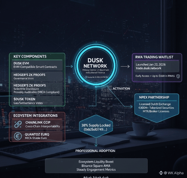 spotted the update in the feed tonight: on january 22, 2026, at 14:07 UTC (post id 2014339263127847160), @DuskFoundation activated the Dusk Trade waitlist—regulated RWA trading platform in collaboration with NPEX, the licensed Dutch exchange overseeing €300m+ in tokenized securities. users sign up at trade.dusk.network for early access and eligibility for up to $500 in RWAs. no on-chain param adjustment triggered, but it boosts ecosystem liquidity, with staking pools at address snippet 0xb2bd0749... maintaining ~38% supply locked as institutional flows align with Chainlink CCIP for cross-chain interoperability and Quantoz's EURQ for MiCA-stable euro support.