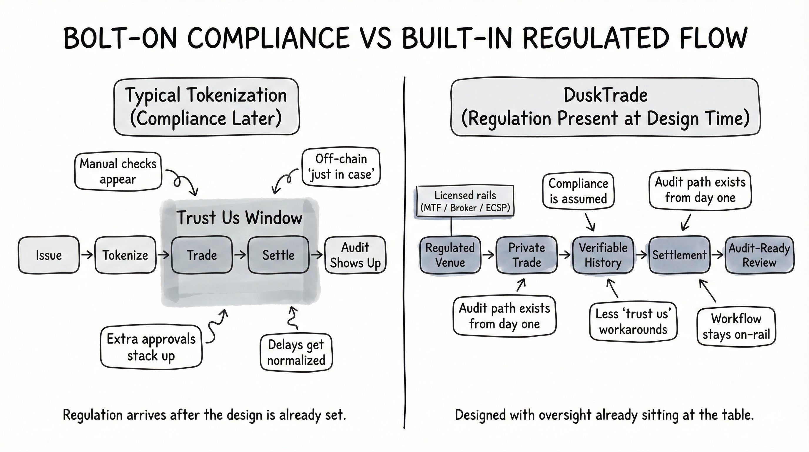 Everyone talks about tokenization as if the hard part is putting assets on a blockchain. It isn’t. The hard part is making those assets live in an environment where regulation doesn’t feel like an afterthought. Where compliance isn’t bolted on later. Where institutions don’t have to choose between privacy and auditability.