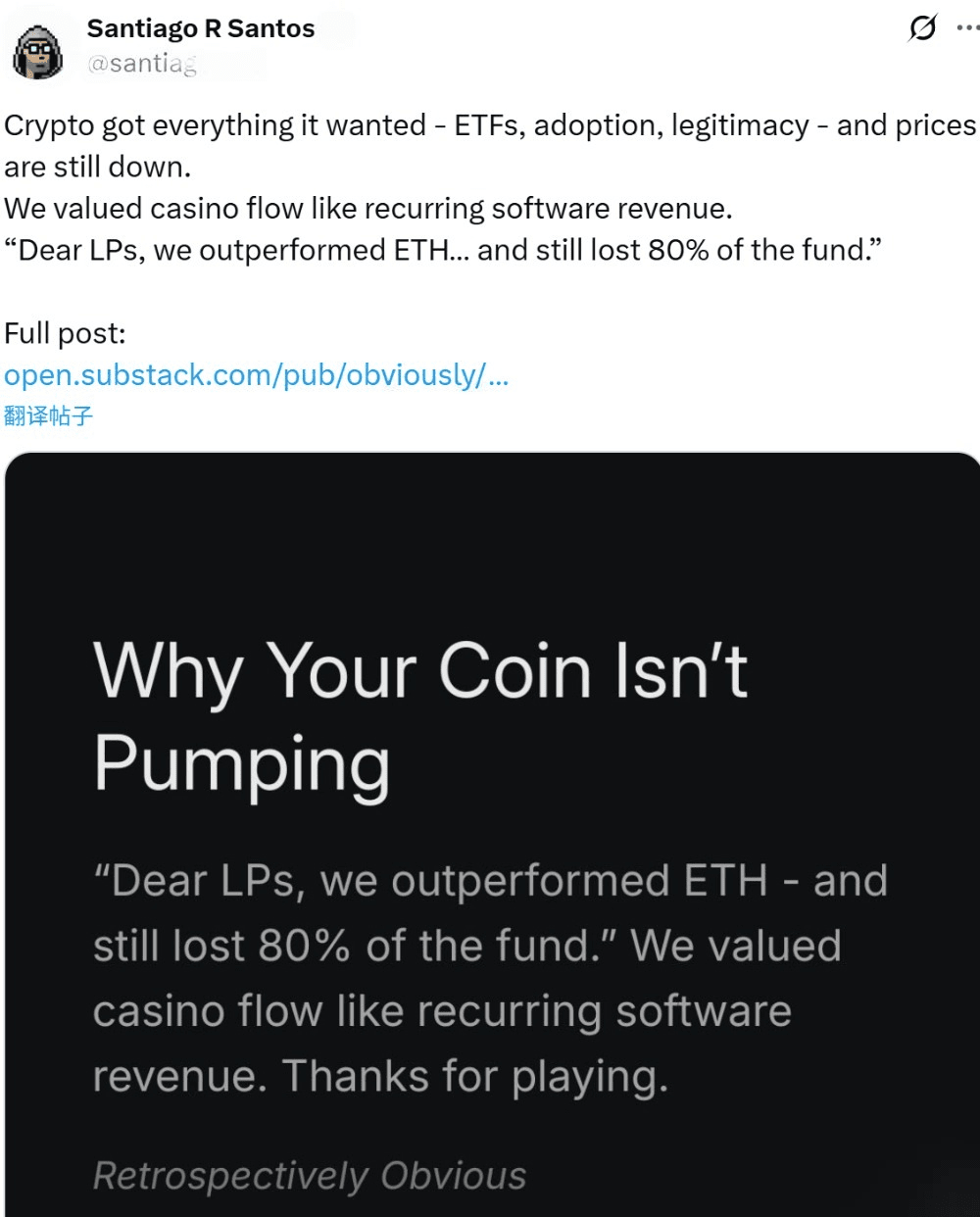 Recently, an article from Santiago (an OG investor who entered the circle in 2013) caused a huge stir in the English community. He analyzed the structural problems facing the current cryptocurrency industry in a rational and systematic way: even with favorable regulations, institutional entry, and improved infrastructure, the prices did not respond. This observation deserves serious consideration from all long-term participants.