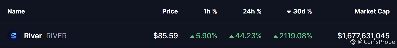The market didn’t take long to react. Within just one hour of the announcement, $RIVER surged 5.90%, adding to an already explosive rally. At the time of writing, RIVER is trading around $85.59, boasting a market capitalization of roughly $1.67 billion. The token is up 44% in the last 24 hours and an eye-catching 2,100% over the past 30 days, firmly placing it among the strongest performers in the current market.