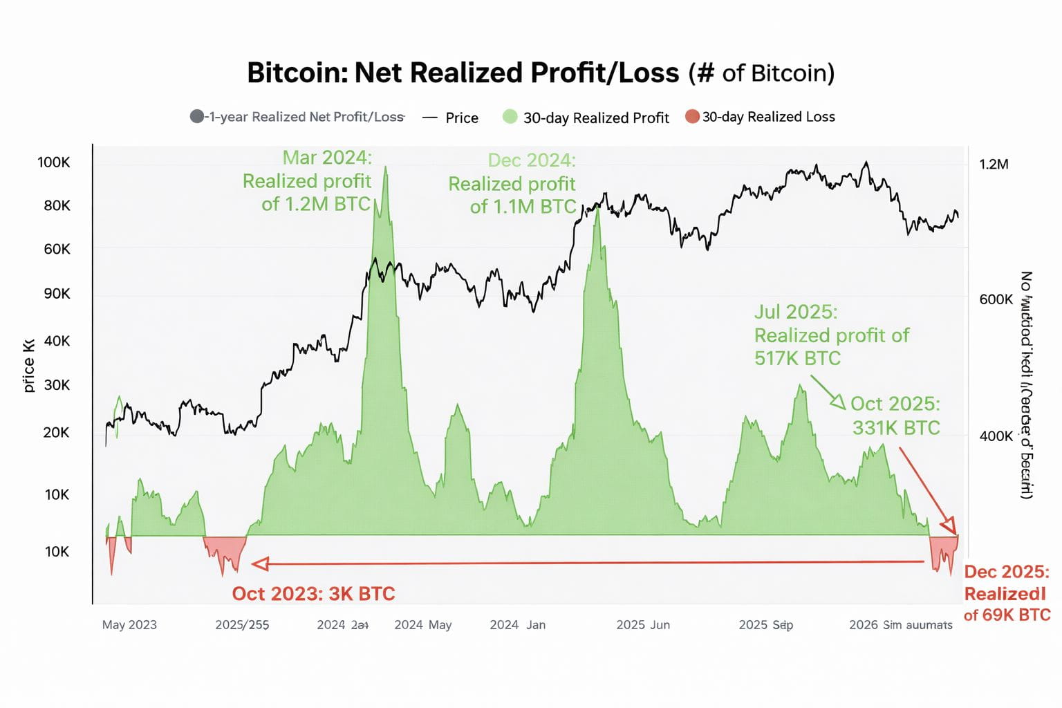 The market $BTC is entering a sensitive phase as actual profit and loss flows decline sharply. The rush of profit-taking at the beginning and end of 2024 has created momentum for clear price increases, but the recent rise in actual losses indicates that surrender pressure is quietly forming beneath the surface of the market.