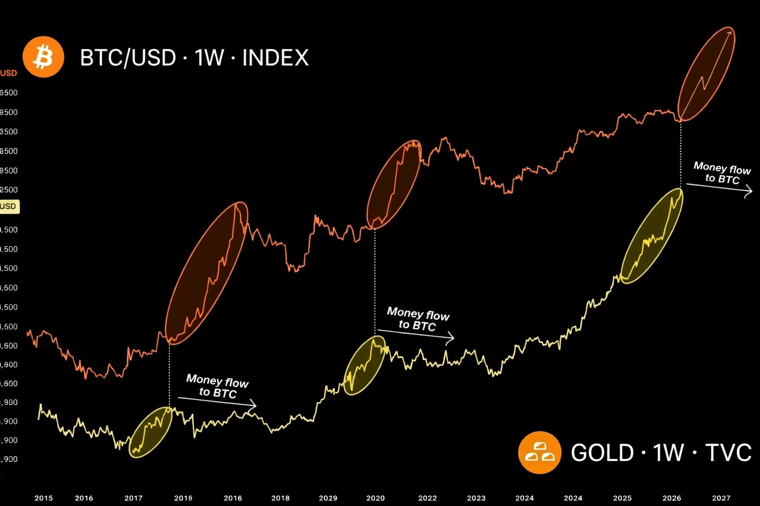 While gold is rising strongly as a traditional safe-haven asset, Bitcoin has been price-constrained for a long time, causing the valuation gap between these two 'golds' to widen.