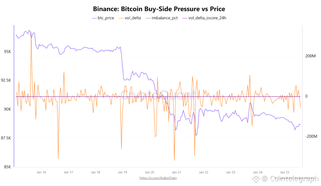 Volume delta z-score readings, it added, represented “short-term tactical selling pressure rather than a phase of panic or widespread forced liquidation.”