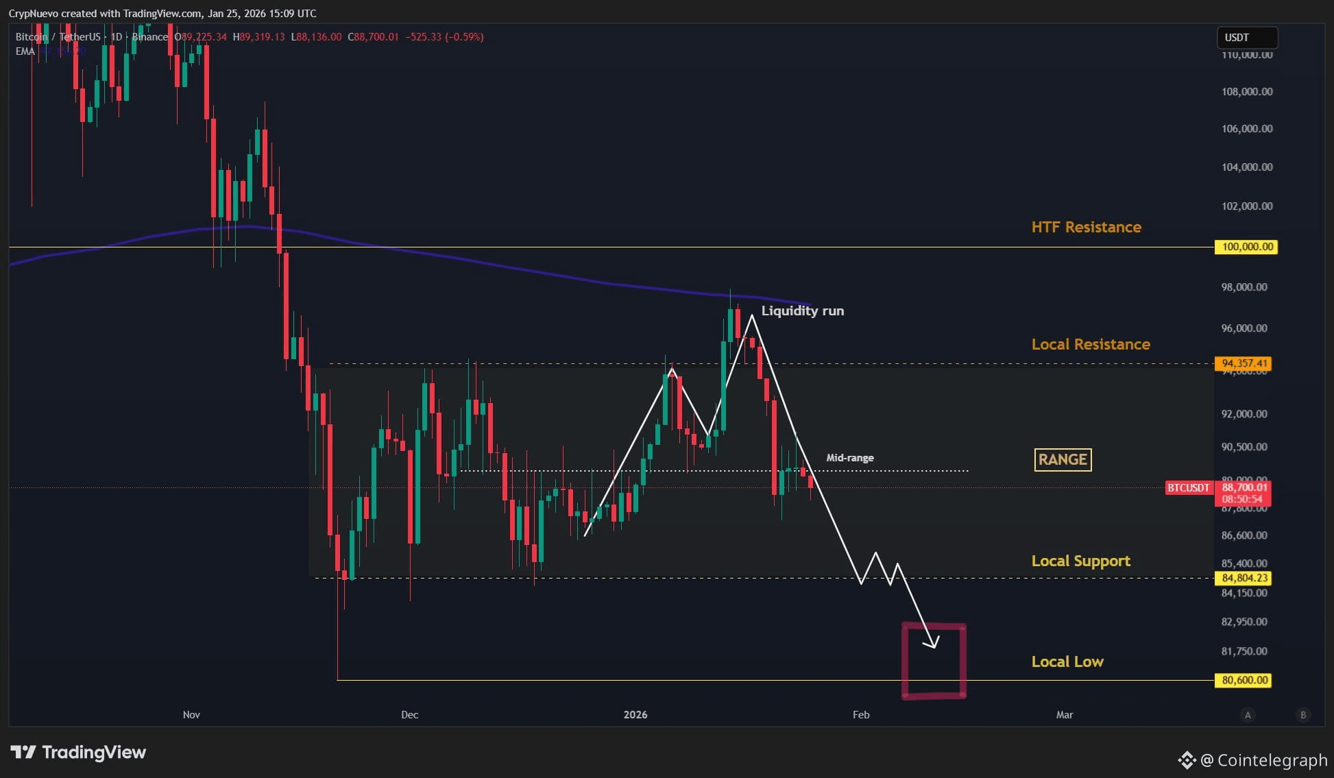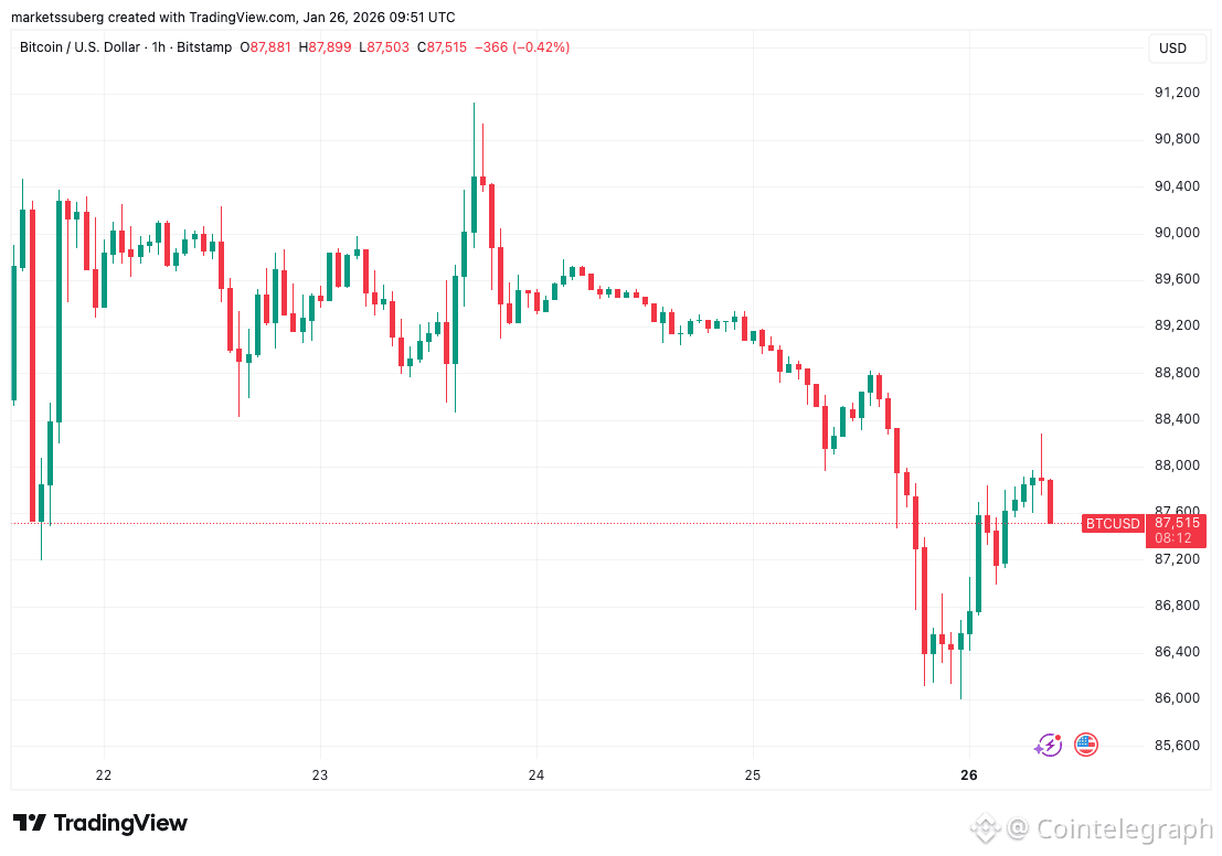 In his latest analysis, Alan warned of consequences in the event of a weekly close under the 2026 yearly open level near $87,500 and the 100-week simple moving average (SMA) at $87,250.