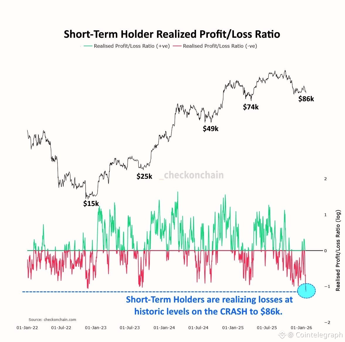 “Short-term holders are realizing losses at historic levels on the bitcoin CRASH to $86k,” it stated.