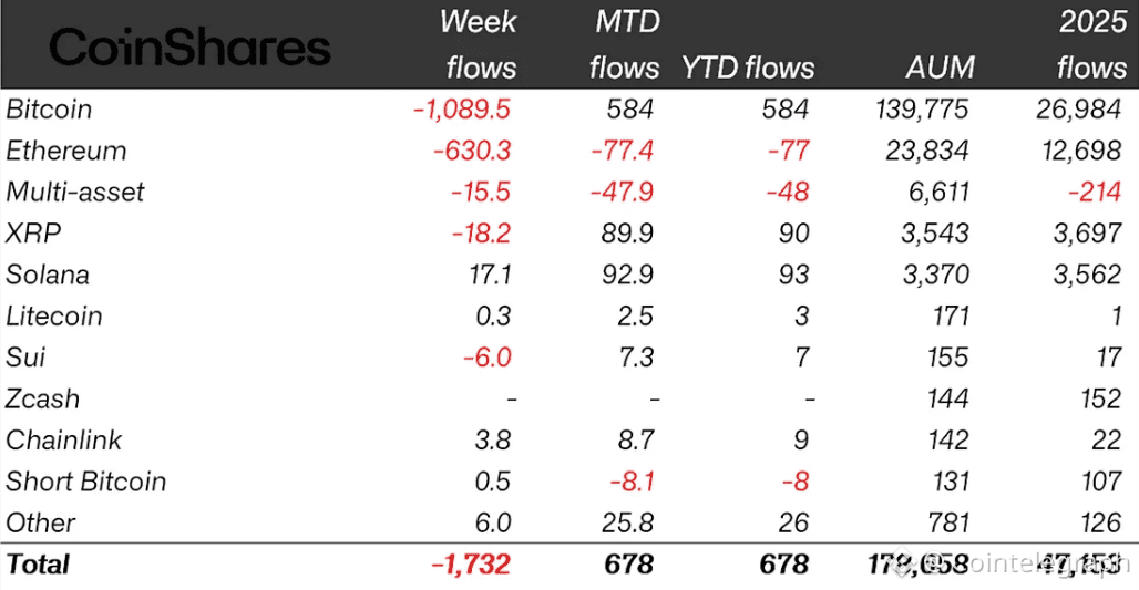 Bitcoin (BTC) and Ether (ETH) led outflows from crypto funds last week, with withdrawals of $1.09 billion and $630 million, respectively.