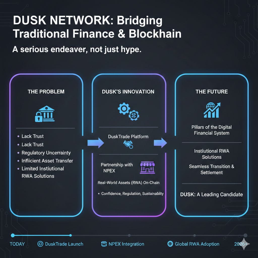 In summary, Dusk Network is not a promotional project, but a serious attempt to redefine the relationship between blockchain and traditional finance. Through DuskTrade and its partnership with NPEX, it offers a practical model for how real assets can confidently, regulatedly, and sustainably transition to the chain. In a world searching for institutional solutions for RWA, Dusk appears to be a candidate to become one of the pillars of the upcoming digital financial system.