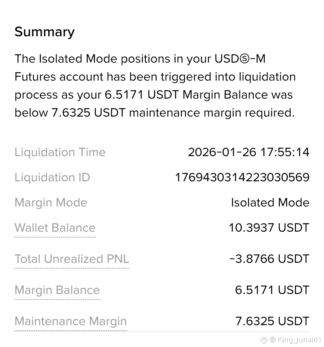 This is where I got caught. Binance requires you to keep a minimum amount of money, called Maintenance Margin, to keep the trade open. In my case, I needed about $7.63 to keep my $450 position alive. As soon as $VANRY dipped slightly and my account value dropped below that $7.63 "red line," the system automatically closed my trade to protect itself.