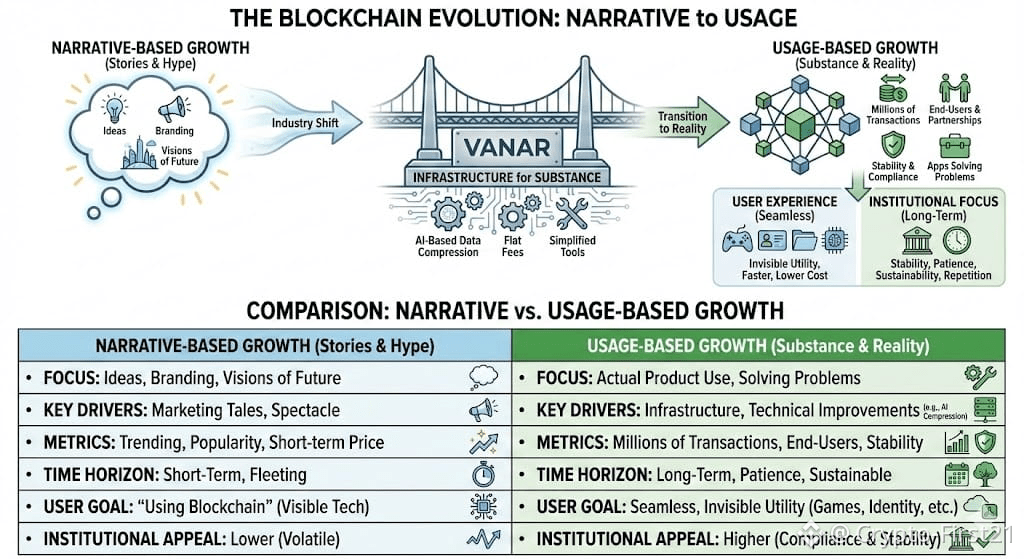 In simple terms, narrative driven growth relies on ideas, brands, and future visions. Usage driven growth, on the other hand, relies on users using the product. While it sounds minor, it is a huge difference. If a blockchain is used by millions of users, has millions of transactions, and has applications used to solve real problems, it becomes a business with a real value. Vanar’s recent direction of development speaks to this kind of mindset. Instead of being heavily focused on marketing stories, it has been heavily investing in infrastructure to support users and day to day use, such as AI powered on chain data compression, flat transaction fees, and tools to automate complexity.