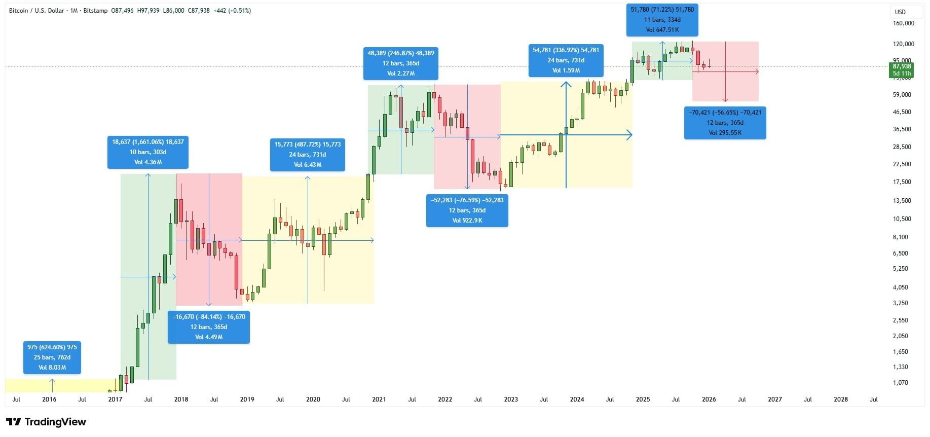 According to the structure above, the bullrun phase of this cycle ended in October 2025, at the peak region. From that point on, the market entered the bear market phase, and according to the cycle logic, this phase could last until around October 2026.