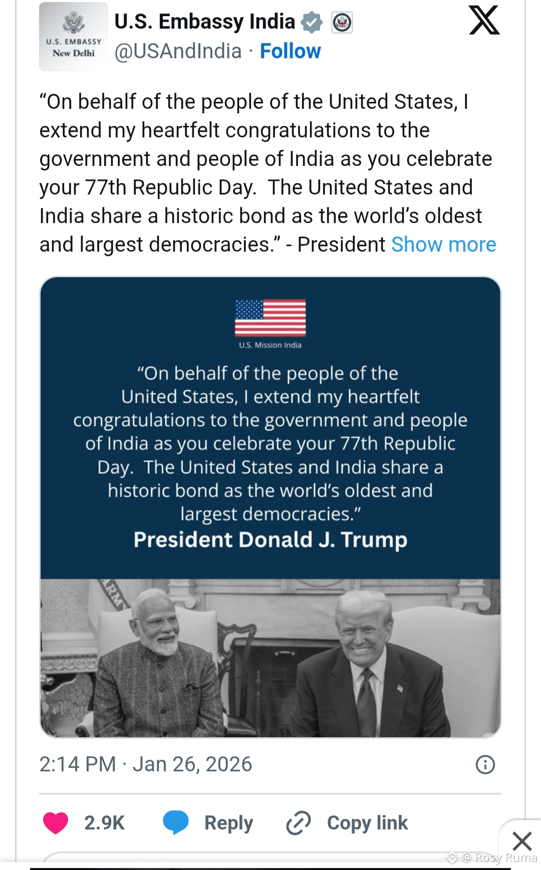 In a Republic Day message shared by the US Embassy in India on X, Trump congratulated the Indian government and its people, acknowledging the constitutional milestone that transformed India into the world’s largest democracy in 1950.