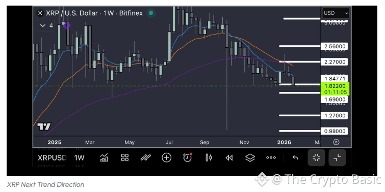 If $1.85 fails, the next support emerges near $1.69, where buyers may attempt to stabilize price action. Beyond that, intensified selling pressure could drive XRP toward $1.27 or $0.98, both of which represent potential long-term support in a broader market downturn.
