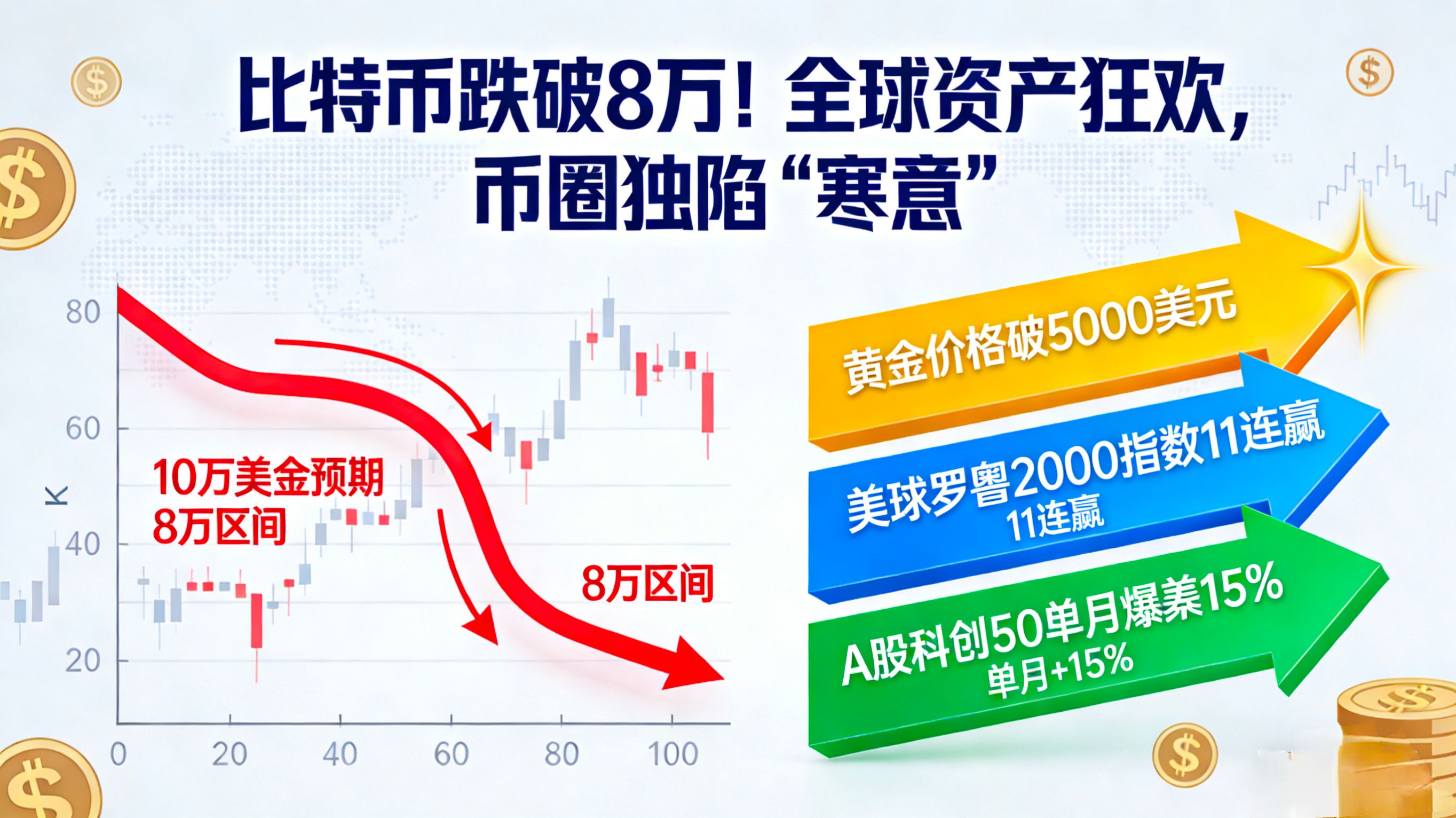 On one side, there is a frenzy of assets with gold breaking $5,000 and the A-share Science and Technology Innovation 50 soaring 15% in a single month; on the other hand, the expectation for Bitcoin has dropped from $100,000 to the $80,000 range. Why has the crypto market uniquely faced 'chill' since Trump took office? The triple storm of macroeconomics, capital, and sentiment is reshaping the market landscape.