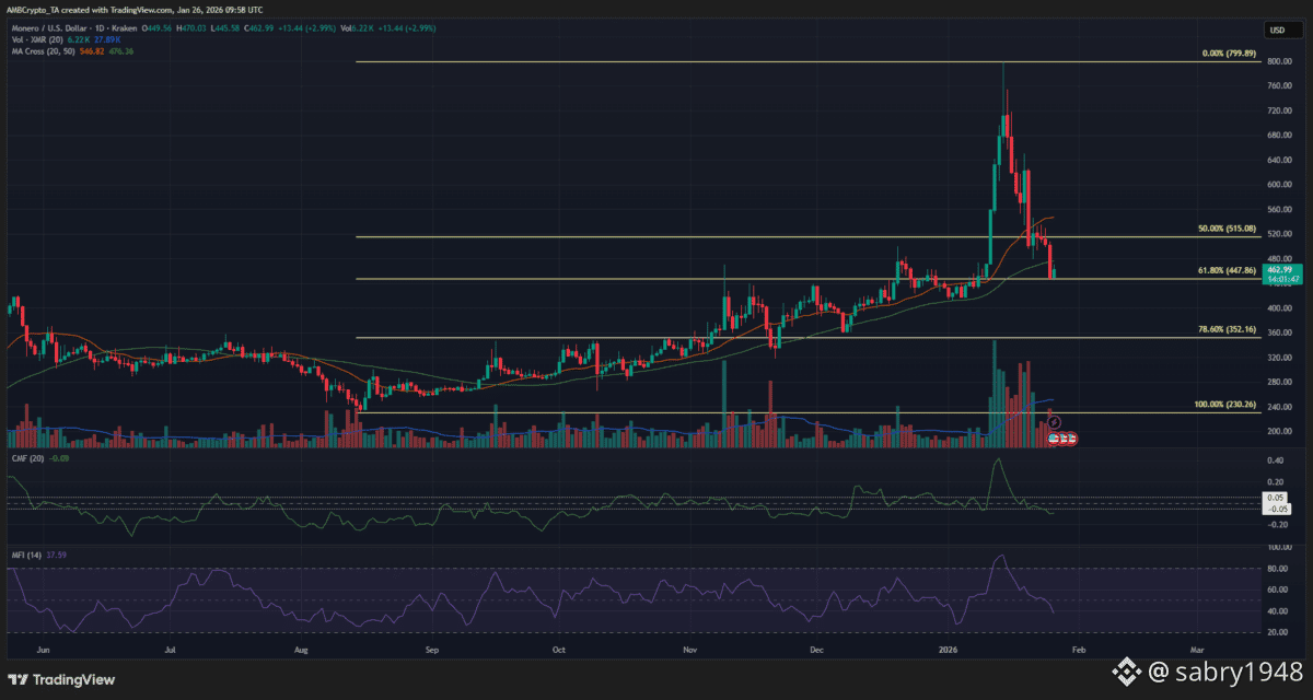 · تشير سرعة صعود مونيرو وتراجعها اللاحق إلى أن موجة الصعود قد تكون انتهت، خاصة مع ضغوط البيع على البيتكوين.