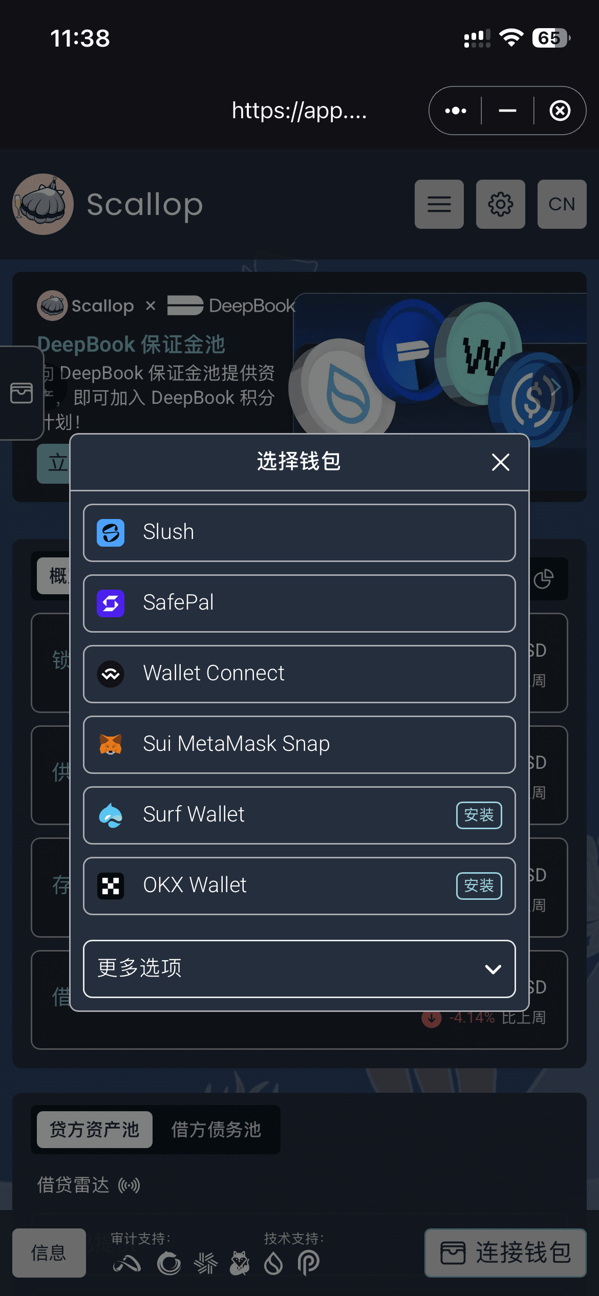 Taking the lending protocol Scallop on Sui as an example, just open the SafePal App, enter the 'Explore' interface, input the website at the top, and select the chain (as shown in image 1). Then connect the wallet (as shown in images 2 and 3), and you can use the functions of the protocol.