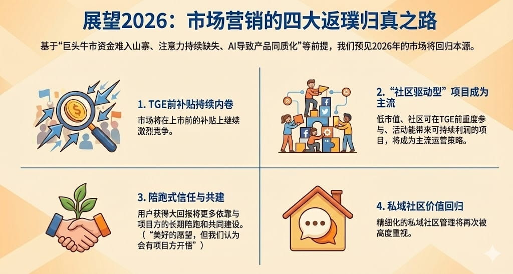 My thoughts on the marketing trends for 2026: A bull market driven by national and traditional capital giants will find it difficult to enter the altcoin market; attention will be even more fragmented, and the ROI of marketing focused solely on public domain traffic will approach negative numbers; the era of AI makes it harder for projects to differentiate themselves technically and product-wise, while the homogeneity of content created by 'universal creators' on X will gradually make users lose interest; more open regulations will give rise to more competition for attention in other public and private domains.