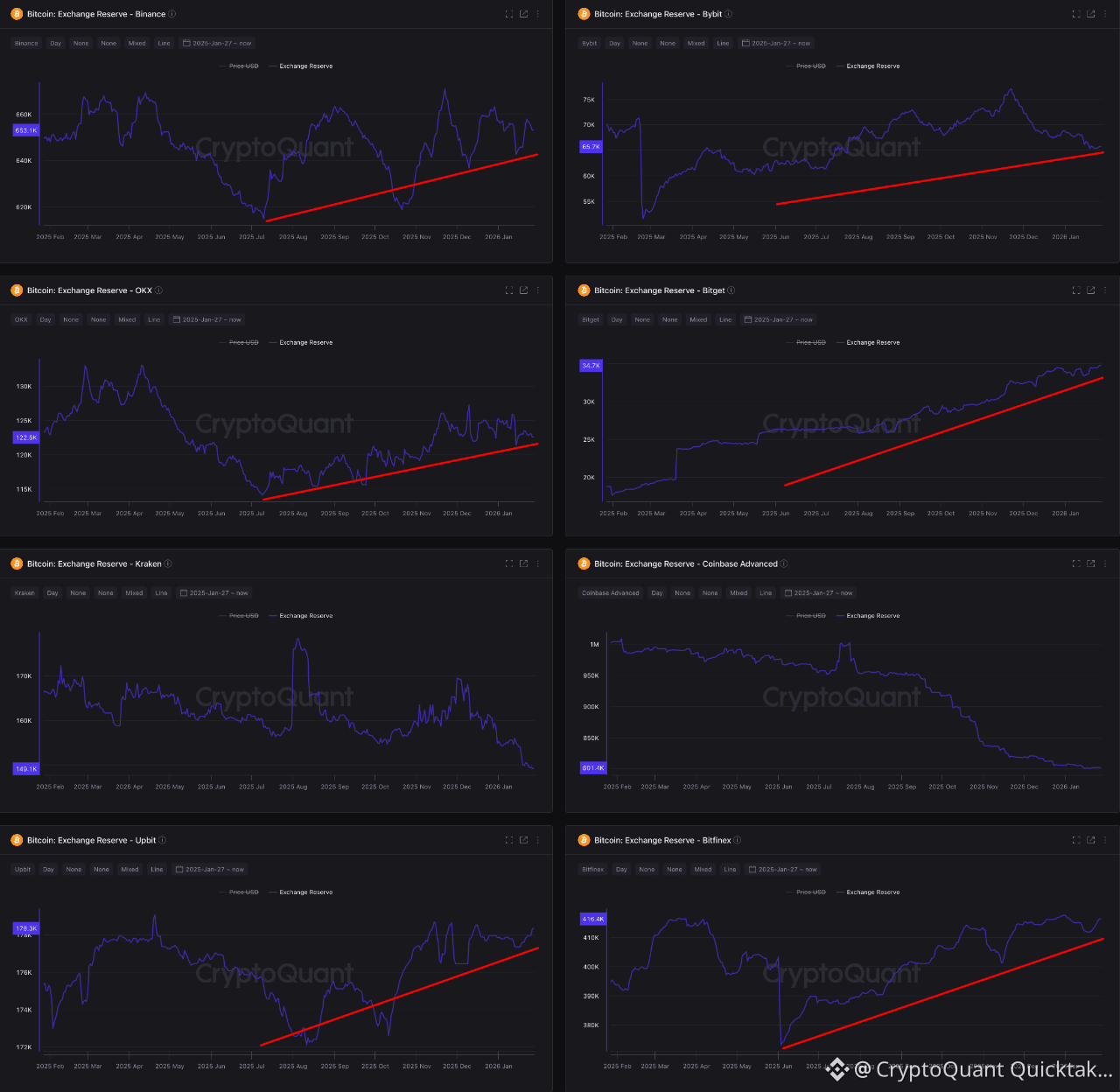 Bitcoin spot reserves on major exchanges have been rising since June 2025 - consistent with either ongoing distribution or capital positioning ahead of a broader market move 🧸 DYOR