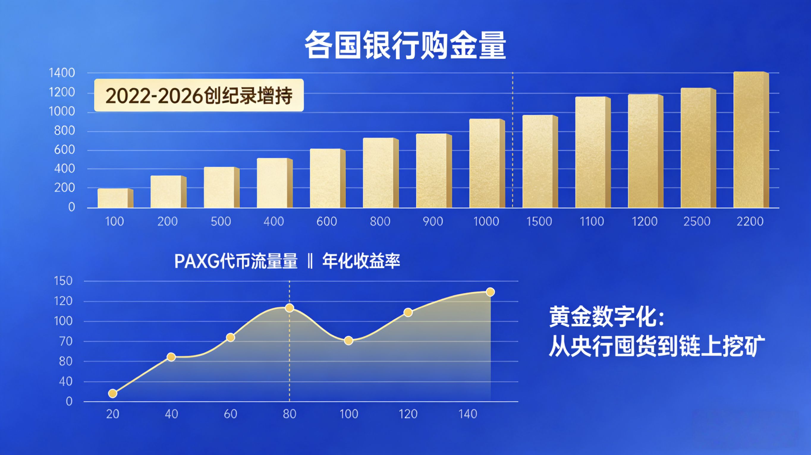 In the digital world, the value logic of gold has been completely reconstructed by blockchain technology. Tokens such as PAXG and XAUT, which are pegged to physical gold, achieve a 1:1 asset backing, preserving gold's anti-inflation properties while addressing the pain points of poor liquidity, difficulty in fragmentation, and high storage costs associated with physical gold, becoming a 'bridge asset' connecting traditional finance and the crypto market. Data shows that by 2025, the total issuance of stablecoins pegged to precious metals globally will exceed $5 billion, with PAXG's market value reaching $2.8 billion and daily trading volume increasing by 270% compared to 2024. Even more innovative is the 'gold collateral mining' model, where users deposit PAXG into DeFi protocols, earning stable annualized returns of 8%-12% while participating in arbitrage from gold price fluctuations. This 'traditional assets + on-chain finance' approach has attracted a large number of traditional gold investors, pushing the digital allocation ratio of gold from 0.8% in 2023 to 3.2% by early 2026. Although gold prices may experience a short-term correction of around 10%, the triple support from central banks buying on dips, long-term allocation funds, and on-chain demand has led Deutsche Bank to maintain a positive outlook on its long-term trend, predicting that gold prices could reach $6,000 per ounce within the year, while the market value of crypto tokens pegged to gold may also exceed $10 billion simultaneously.