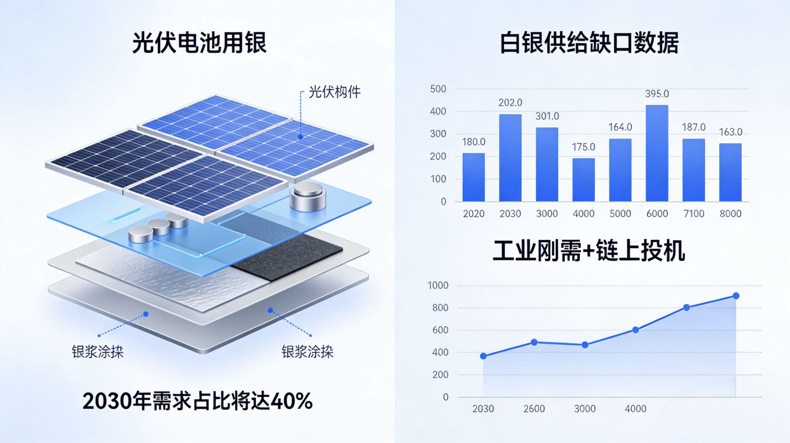 The silver market is characterized by a threefold explosion of 'precious metal attributes + industrial attributes + on-chain speculative attributes', making it the 'king of elasticity' between traditional and emerging markets. The supply side has already sounded the alarm: silver has been in a supply-demand gap for five consecutive years, with a cumulative gap of nearly 820 million ounces from 2021 to 2025, equivalent to an entire year's global production. More critically, 70% of silver production is a byproduct of gold, copper, lead, and zinc mining, making it impossible to expand production independently. Coupled with declining ore grades, ESG policy restrictions, and insufficient long-term investment, the supply side is virtually 'inelastic'. The demand side faces a double whammy: the demand for silver in the photovoltaic industry has surged, with its material cost share in solar cells skyrocketing from 14% to 29%, and it is expected that by 2030, photovoltaic demand will account for 40% of total silver demand; while private investment demand in China and India has exploded, with India even including silver as collateral for loans, further activating market liquidity.