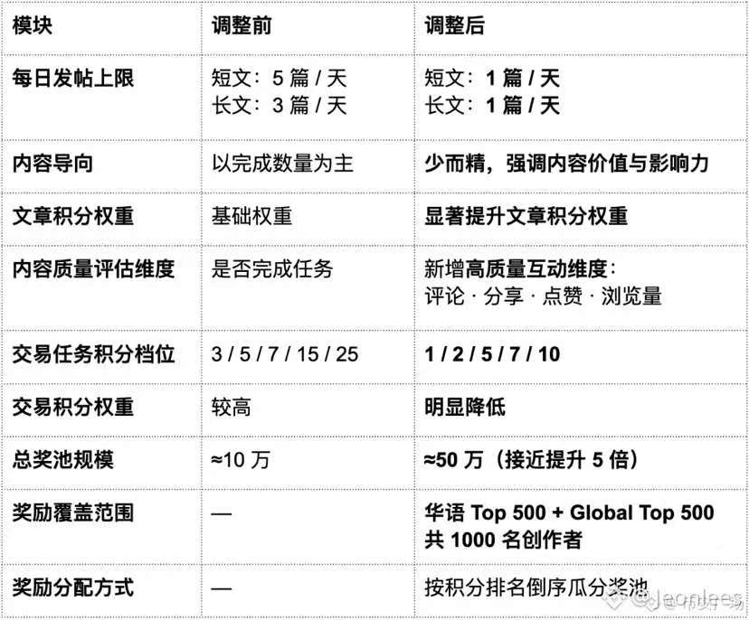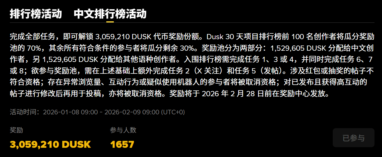 🔶 The mechanism is to complete writing tasks daily to earn points. Daily long articles score 10 points, short articles score 5 points, and participation is mandatory. Sharing next door should score 10 points. In-depth research experience: To analyze the project more thoroughly, you can choose small trades to personally experience its token economic model. This can make your analysis article more persuasive. (Please note: cryptocurrency trading is extremely risky, and any trading decisions must be independently judged and at your own risk.) The top 500 on the leaderboard will be rewarded with 70% tokens, with the remaining rewards distributed proportionally. The official said that rewards will be issued on February 28, 2026.