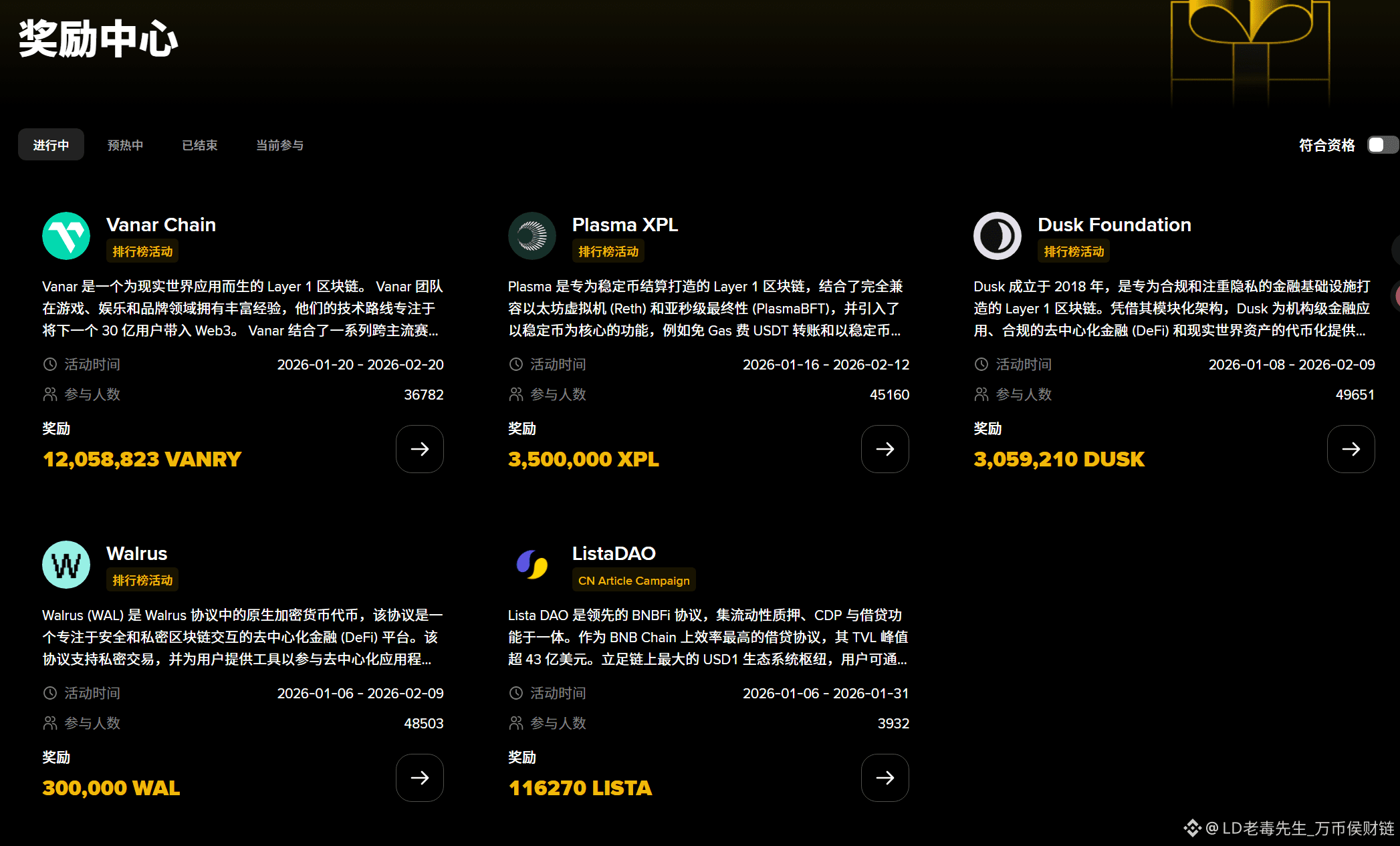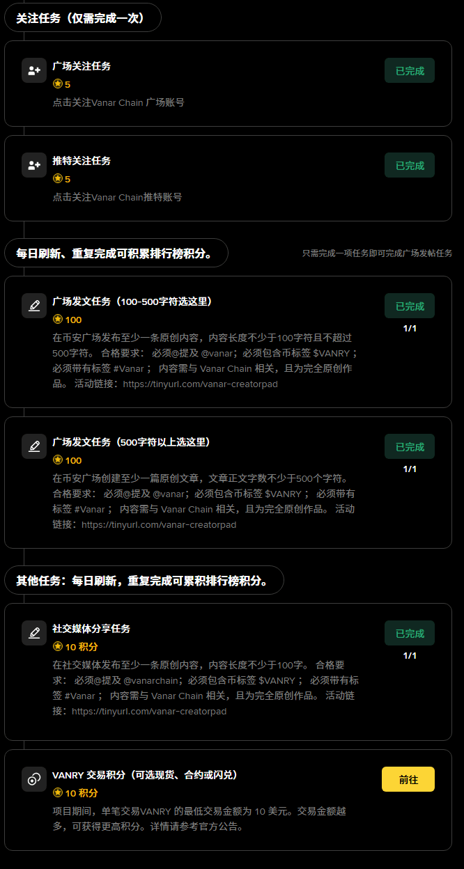 🔶 The core of the Binance Creator Task Platform lies in persisting daily to complete high-quality writing tasks. Preparation is simply having hands! It is not like high-intensity platforms that require pandering to KOLs or global rankings. Here, Binance emphasizes a fair mechanism. As long as you write seriously and produce high-quality articles, anyone can earn small rewards. The platform integrates posting 🥉, trading 🏅, and interaction 🎖 in various ways, with rewards directly distributed in the project's tokens. It focuses on 'short, flat, and fast.' Activity cycles usually last 1-2 months, for example, Vanarchain runs from January 20 to February 20. Creators need to accumulate points to participate in rankings, and the top 100 receive rewards, while those who didn’t make it to the board can still proportionally share the remaining prize pool.