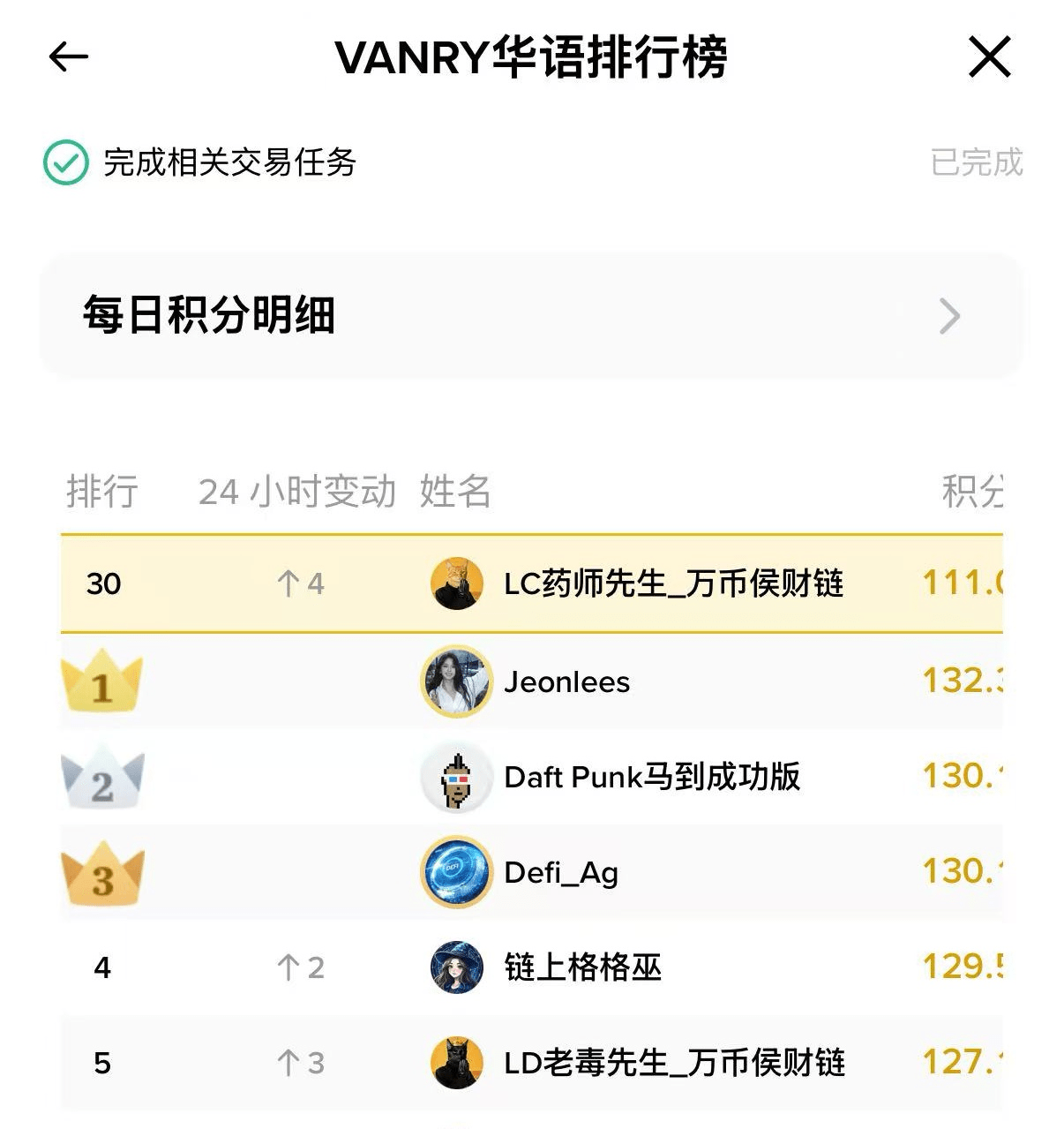 💿 Step 4: Complete daily trading tasks, such as buying $VANRY. Spot or futures, earn 10 points graded rewards. (After fully researching and understanding the risks, to gain a more intuitive experience, you can choose to trade small amounts with funds you can afford to lose. Please note: Cryptocurrency trading is extremely risky, any investment decisions must be independently judged and at your own risk, and absolutely should not be done for the sake of completing any task.)