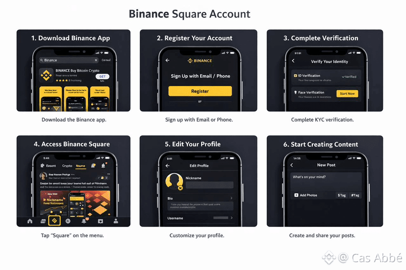 Binance Square is available to everyone who owns a Binance account. The first step would be to open a Binance account on the mobile app or the web and verify your identity (KYC). The guide that any beginner will understand is to download the Binance app, tap Register, register using your email or phone number and a very strong password. Secondly, confirm your identity by uploading an ID document and face scan. When confirmed, access to Binance Square is available through tapping on the Feed/Square tab in the app or clicking on Square on the Binance site.