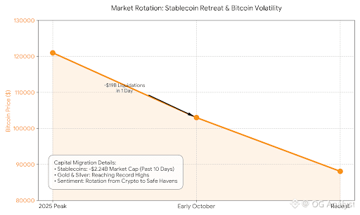 Over the past 10 days, the combined market capitalization of the top 12 stablecoins has declined by roughly $2.24 billion. That’s a meaningful shift, and it caught my attention because it points to a broader rotation of capital — from crypto into traditional safe havens like gold and silver.