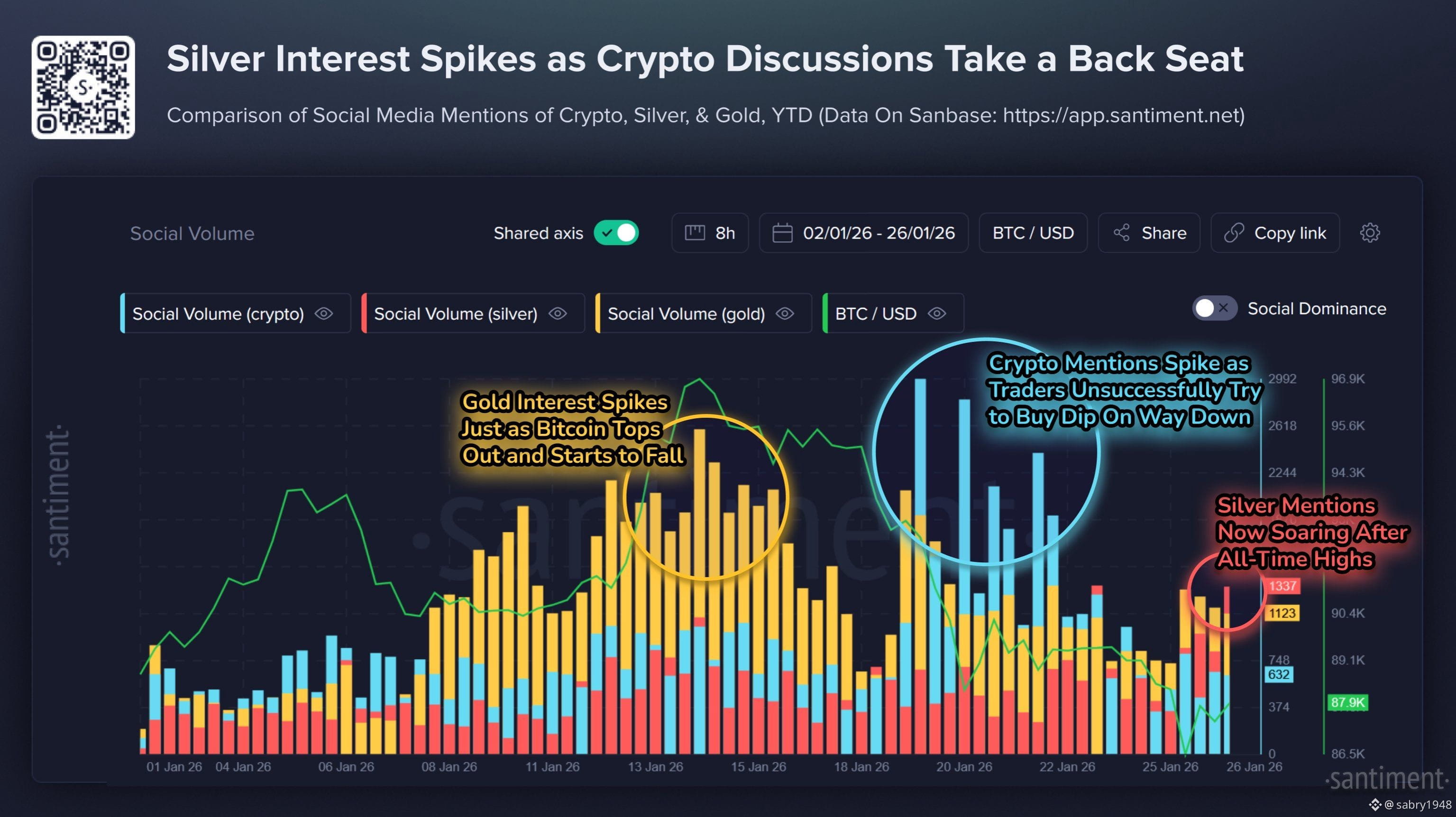 تشير تحليلات شركة سانتي منت (Santiment) إلى وجود "استسلام للتجزئة"، حيث يقوم العديد من المتداولين الصغار ببيع ممتلكاتهم من العملات الرقمية لملاحقة المضاربة في الذهب والفضة، وهي حركة شوهدت غالبًا قرب قيعان السوق في الدورات السابقة.