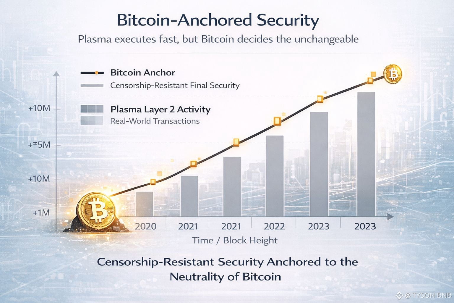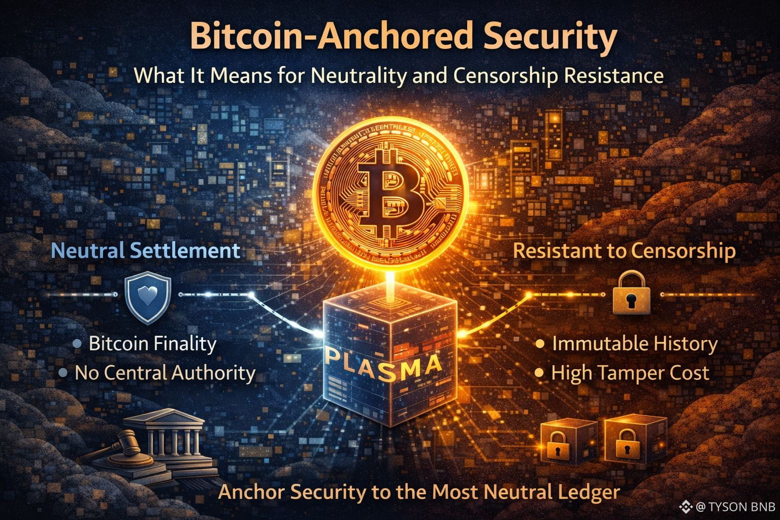 Neutrality is easy to promise and hard to maintain. Most blockchains claim to be neutral infrastructure, yet their security models quietly introduce points of influence: validator cartels, governance politics, token incentives, or regulatory pressure concentrated on a small group of operators. Over time, these pressures shape what gets included, delayed, or quietly ignored. This is where the idea of Bitcoin-anchored security enters the conversation, not as a buzzword, but as a design choice with real consequences for censorship resistance. For Plasma, anchoring security to Bitcoin is less about borrowing reputation and more about outsourcing final authority to the most politically neutral ledger that exists today.