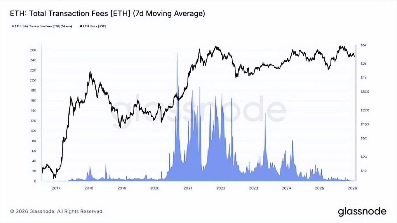 According to Glassnode data, on January 27, Ethereum's total transaction fees dropped to the lowest level since May 2017. The significant decrease in fees enhances the network's scalability and security, while also lowering user transaction costs. This is very beneficial for the development of the ecosystem and lays a foundation for future growth.