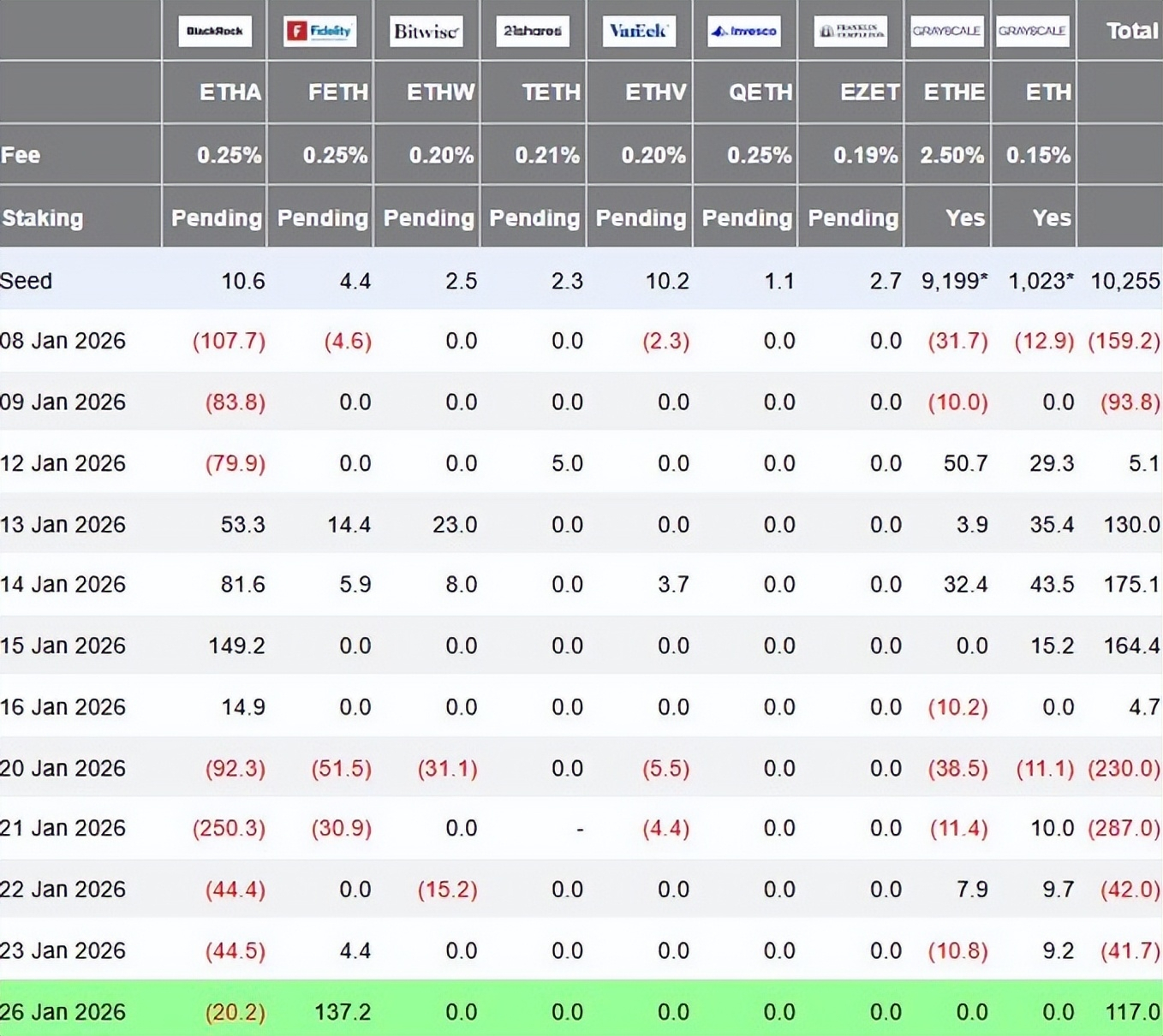 On January 26, after a period of adjustment, Ethereum rebounded, with the U.S. spot Ethereum ETF recording a net inflow of $117 million. Among them, Fidelity Fund performed the best, with capital inflow reaching $137 million that day, ending a previous four-day streak of outflows. Meanwhile, BlackRock Fund experienced a net outflow that day. This divergence indicates that institutional investors are being more selective in their positions rather than going all in. This has also led traders to start paying attention: are institutions rebuilding their positions or making short-term asset adjustments?#ETH