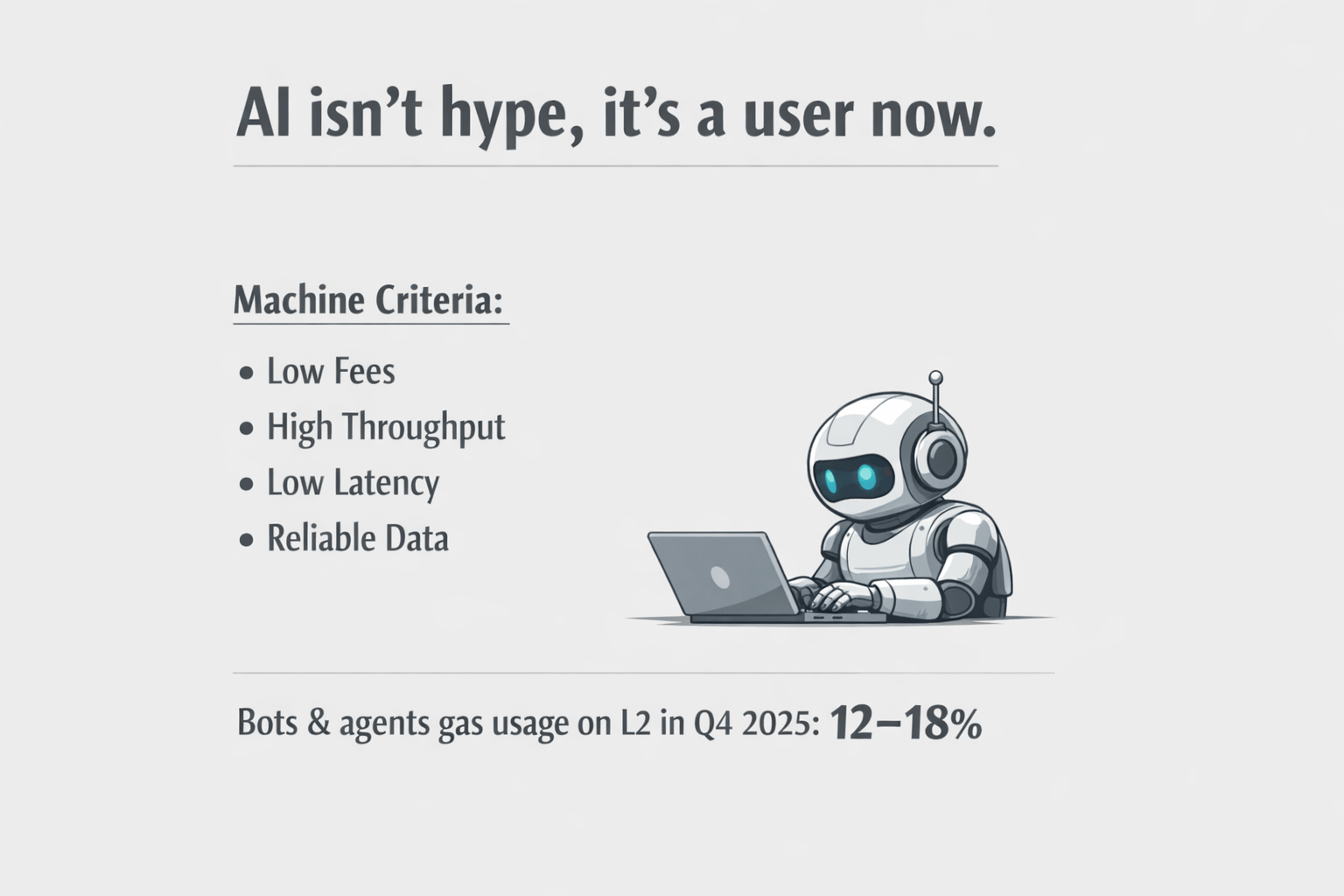 • Gas from 'bot/agent' accounts for ~12–18% on some L2s in Q4/2025 (up from ~4% in early 2025).