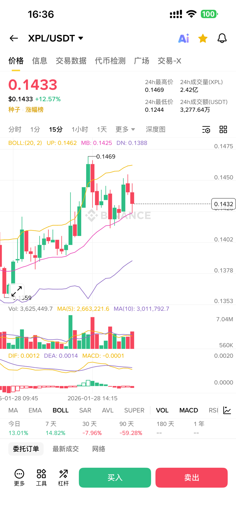 When I saw that steep, almost vertical green K-line on the screen, I was taken aback. Yesterday, XPL was like a dead calm, languishing around $0.12 without any vitality. But today, it surged from a low of $0.124 to a high of $0.1469 within 24 hours, exceeding a 12% increase. Such a level of volatility, appearing in an asset that has been in a long-term downtrend, cannot simply be summarized by the words 'it has risen.' This feels more like a long-overdue technical resistance, a psychological battle between bulls and bears centered around key price points, and the battlefield map is that scarred K-line chart.
