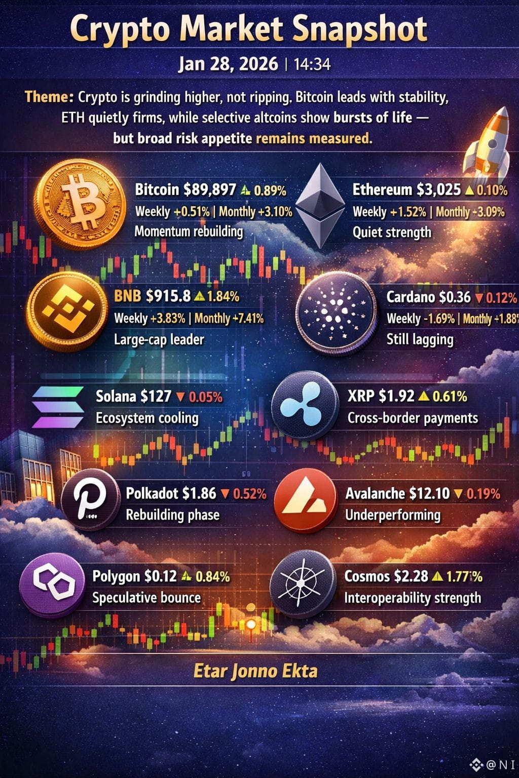 Crypto is grinding higher, not ripping. Bitcoin leads with stability, ETH quietly firms, while selective altcoins show bursts of life — but broad risk appetite remains measured.