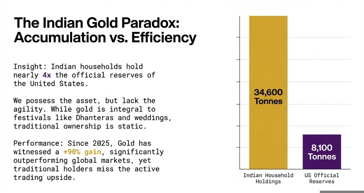 Hum Indians ke Khoon main Gold hai. Let’s be honest, we know gold prices better than Bitcoin prices. Whether it's a wedding, a festival like Dhanteras, or just a safe investment for the future, Gold is our first love. According to a report by IBEF, Indian households collectively hold around 34,600 tonnes of Gold, which is more than 3x to 4x the entire official Gold Reserves of the United States. We literally rule the Gold market!