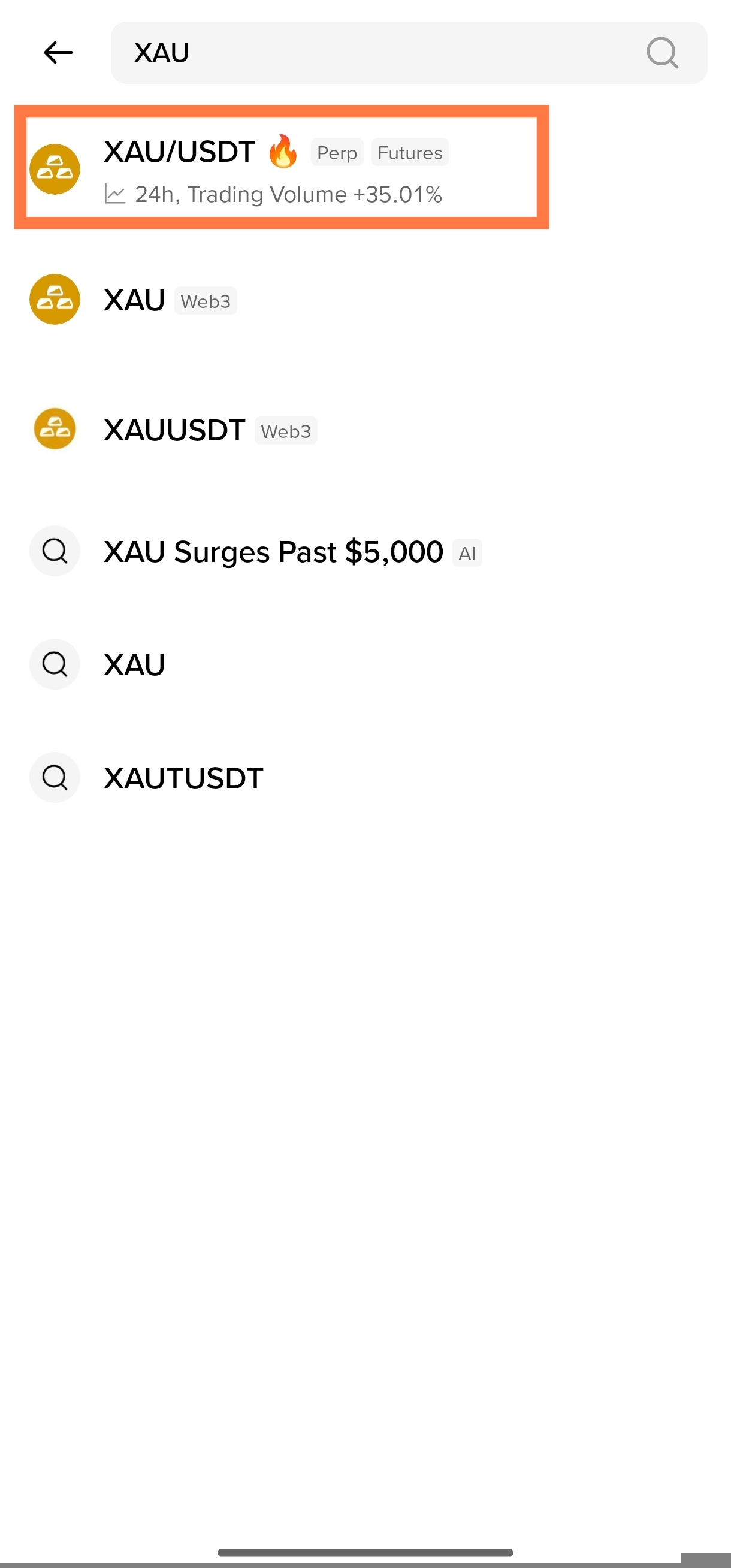 • ​Select XAUUSDT Perpetual from the list. You'll see the Gold bar symbol there.