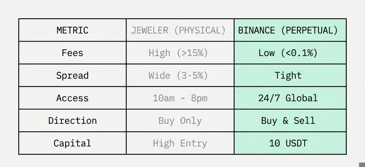 When you buy jewelry, you lose 15% instantly in labor costs. When you buy digital gold on some apps, the "spread" (difference between buy and sell price) is huge (3-5%). On Binance, the fees are a tiny fraction (usually less than 0.1%), meaning more profit stays in your pocket.