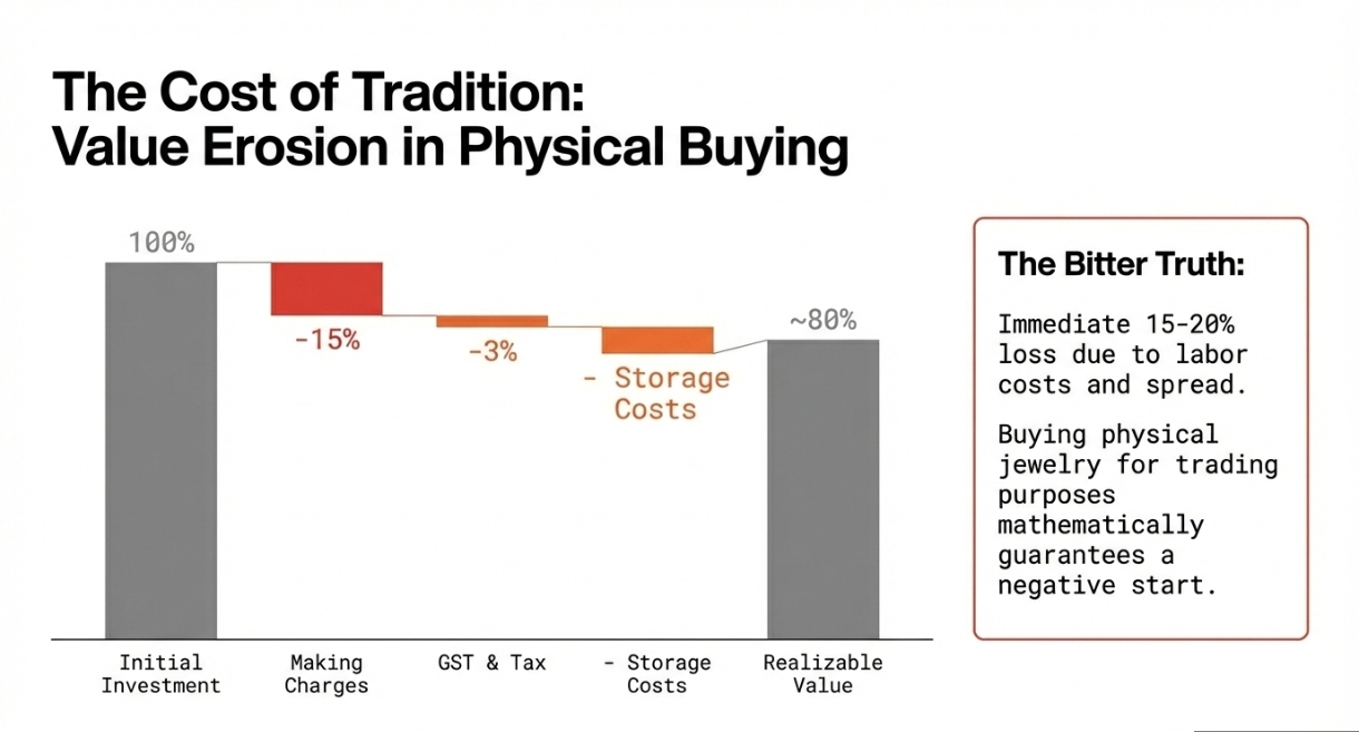 ​But here is the bitter truth: While we are experts at hoarding Gold, we are often terrible at trading it. Buying physical Gold comes with heavy "making charges" (often 10-20% loss instantly), GST, and the headache of storage lockers. Matlab socho hum sab Gold Pehnate jarur hai but trading main Zero hai 😭😭.
