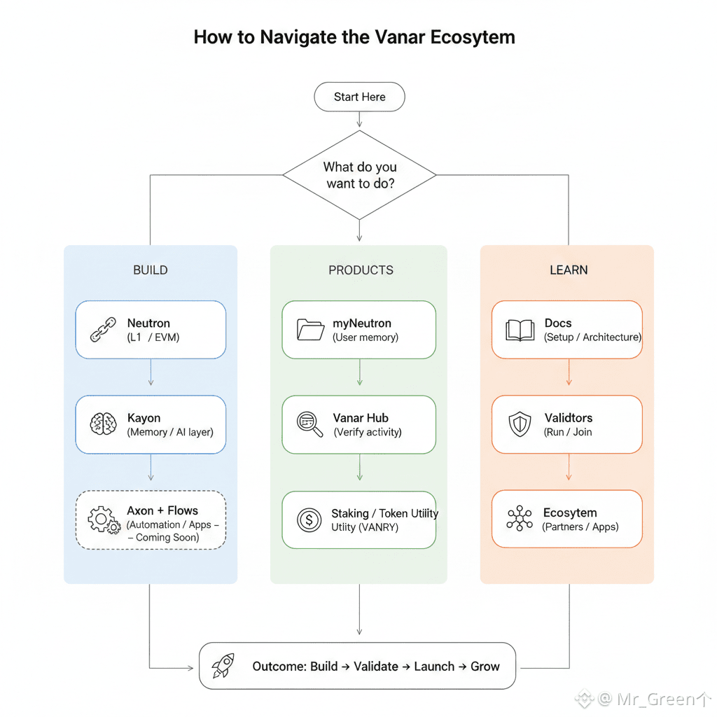 The simplest way to understand how Vanar is organized is to follow the same structure the ecosystem itself presents: Build → Products → Learn. You can see this navigation pattern across Vanar’s site, where “Build” groups the core stack (Vanar Chain, Neutron, Kayon, and roadmap layers), “Products” groups user-facing tools (like myNeutron and staking), and “Learn” collects ecosystem and education resources.