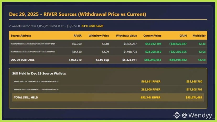 These withdrawals occurred primarily in two major waves. On December 5, approximately 2 million RIVER were withdrawn across five wallets. On December 29, another 1 million RIVER were withdrawn through two wallets, around 80% of which remained unsold at the time of analysis.