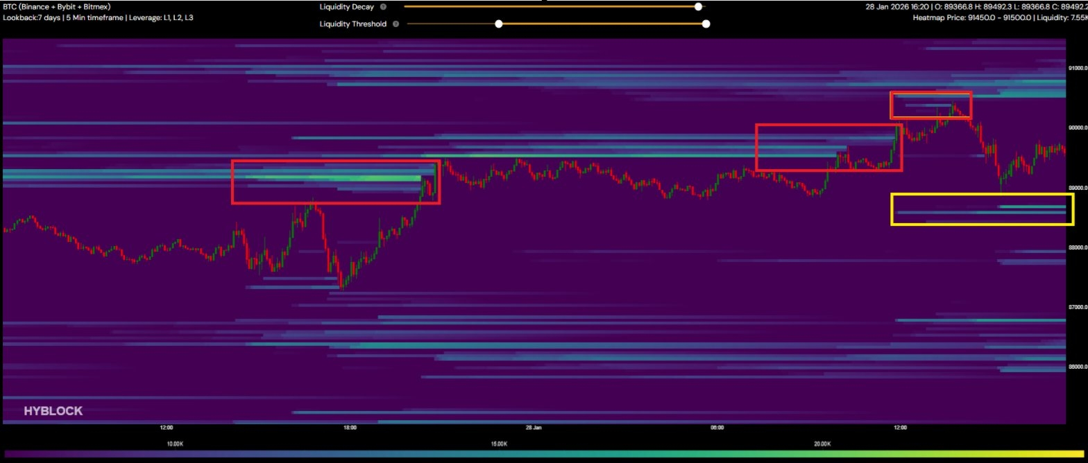 Looking closer: Liquid Shorts are accumulating heavily from 90.5k upwards – a "sea of shorts" is waiting to be hunted. This is exactly why I am still holding my Long position on $BTC. Additionally, Liquid Longs are waiting at 88.7k in significant amounts, this could very well be the price area the market will move up to clear out before turning back to hunt Shorts again.