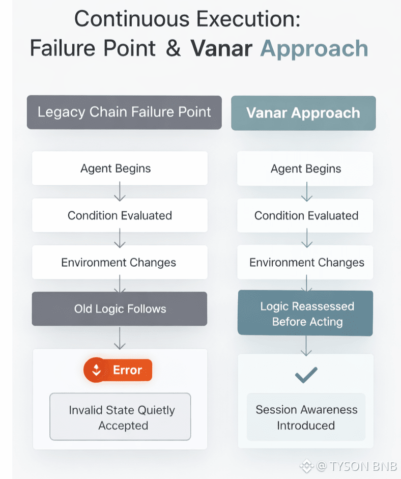 They don’t reintroduce themselves. They don’t naturally revalidate assumptions. They continue operating across state changes that were never designed to be crossed without interruption. And legacy chains, built around discrete user intent, have no clean way to notice when continuity itself becomes the risk.